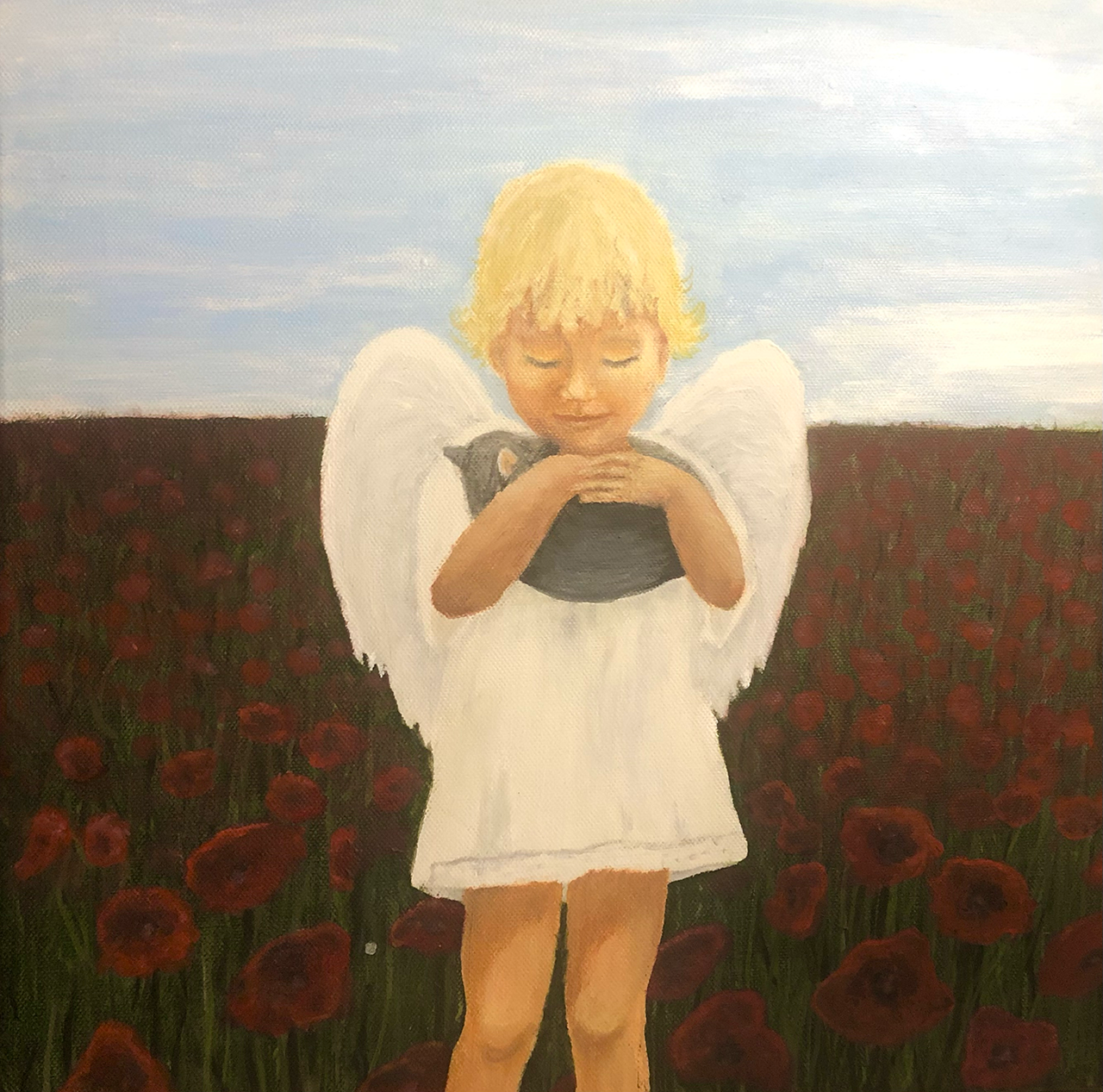 Once upon a time, there was a beautiful little angel named Sofia. She was mostly playing alone as she was special and didn't fit in very well. She lived in a peaceful village surrounded by a vast poppy flower fields. One day, while wandering through the field, she came across a small, abandoned kitten, whom she named Hugo. Sofia took Hugo under her wing and the two became the best of friends. They would spend their days exploring the fields and admiring the beautiful flowers.